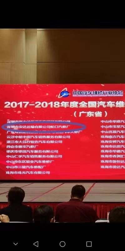 “安达运输有限公司蛇口修理厂”在公司在“中国汽车维修行业协会”举办的“2017---2018年度全国汽车维修行业诚信企业”评比中,从深圳市10000多家维修企业脱颖而出,与其他7家企业一同获得“全国汽车维修行业诚信企业”荣誉称号。